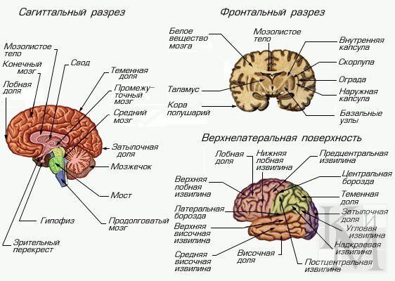 Головной мозг человека ( лат encephalon) является органом центральной нервной системы, состоящей из множества взаимосвязанных между собой нервных клеток и их отростков. Головной мозг человека занимает всю полость мозгового отдела черепа, кости которого защищают головной мозг от внешних механических повреждений. B процессе роста и развития головной мозг принимает форму черепа. Внешне мозг напоминает студенистую массу желтоватого цвета, поэтому в древности считали, что это вещество, которое охлаждает кровь, и при бальзамировании трупов его не хранили. Объем человеческого мозга составляет 91—95 % емкости черепа. В головном мозге различают пять отделов: продолговатый мозг, задний, включающий в себя мост и мозжечок, средний, промежуточный и передний мозг, представленный большими полушариями. Наряду с приведённым выше делением на отделы, весь мозг разделяют на три большие части:Полушария большого мозга;Мозжечок;Ствол мозга. Кора большого мозга покрывает два полушария головного мозга: прав