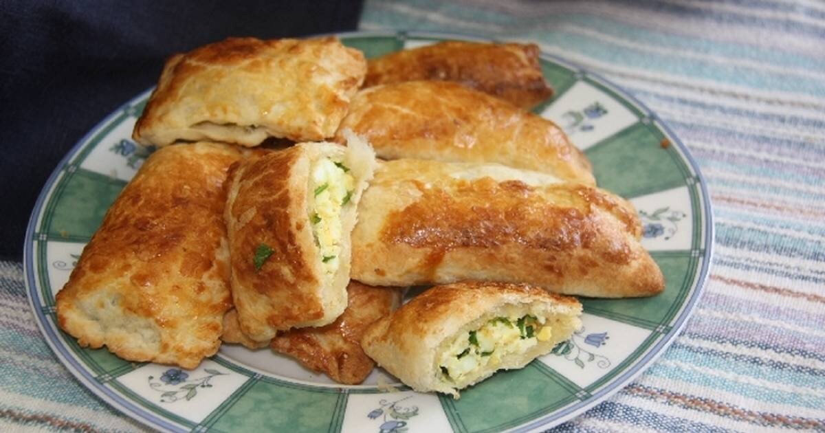 Яйца залейте водой и поставьте вариться, 10-15 минут после закипания, чтобы яйца были вкрутую, затем остудите и почистите. Пока размораживается слоёное тесто, нарежьте мелкими кусочками яйца, лук нашинкуйте. Смешайте эти два ингредиента вместе, добавьте соль по вкусу и немного (примерно 20 г) размягчённого сливочного масла. Хорошо перемешайте. Раскатать тесто в пласт, нарезать его на прямоугольники. На одну половинку положите немного начинки, другой прикройте и защипните края. Готовые пирожки выложите на противень, застеленный пергаментной бумагой, слегка смазанной маслом, смажьте взбитым яичным желтком или крепкой сладкой чайной заваркой, и выпекайте в разогретой до 180ºС духовке 20-25 минут. П