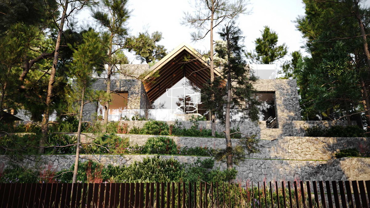 Композиция здания складывается из двух двухэтажных объемов, которые объединены остекленным двухсветным пространством с гостиной и столовой. К центральная части со стороны главного фасада примыкает терраса с двусторонним камином. С противоположной стороны обустроено небольшое патио. Основные зоны дома — гостиная-столовая, хозяйская спальня, детская — выделены двускатными кровлями. При работе над домом мы исходили из особенностей ландшафта: архитектурные решения продиктованы рельефом, растительностью и видовыми точками. Натуральный камень на фасадах усиливает связь с окружающими горами, его «рваная» текстура эффектно контрастирует с более гладкими материалами — стеклом и бетоном. Название: Частный дом в Республике Крым