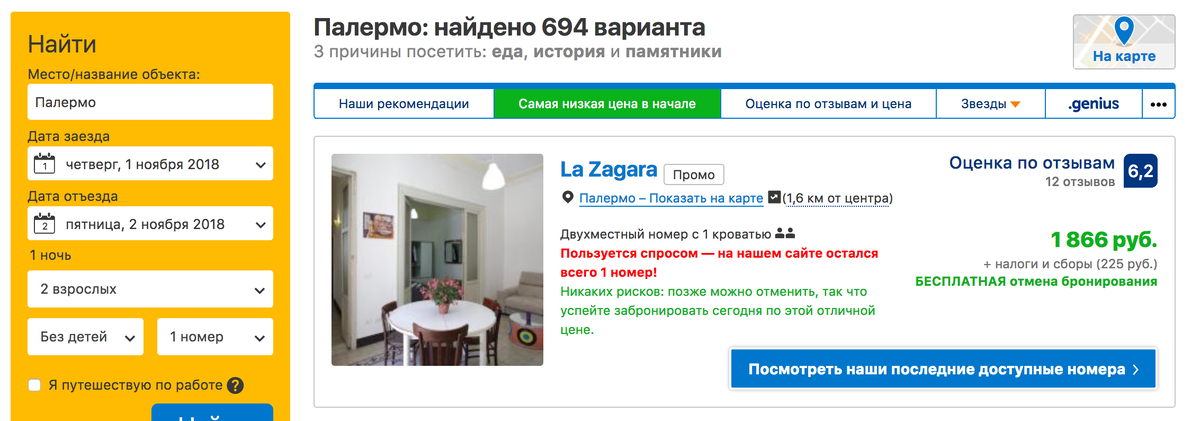 Позавчера у Победы появились билеты на Сицилию по 5100 руб. (аэропорт Палермо)! Причем, для любителей глинтвейна и ёлочек есть даты на католическое Рождество. Но, помимо билетов, надо ещё найти жильё. Расскажу свои мысли на этот счёт. Отели Тут всё ясно: открываем букинг и мониторим свои даты, читаем отзывы и сравниваем цены, они сильно зависят от места. Сейчас самый дешёвый номер в Палермо на двоих стоит 1800 рублей: Частное жильё на любой вкус Апартаменты, B&B («постель и завтрак»), виллы. У моря, в горах или на вулкане. При прочих равных я всегда выбираю этот вариант размещения: с соседями, своей кофеваркой и личным балконом/террасой. Чтобы «жить», а не «останавливаться» в новом городе. Обычно снимаю такое жильё на эйр-би-эн-би. Снять жильё можно дешевле, обратившись к местным жителям, то бишь имея знакомых или друзей. Эйрбнб и букинг берут нехилый процент за свои услуги, поэтому, обращаясь к хозяину напрямую, можно получить лучшую цену и заодно консультацию по поводу того, как