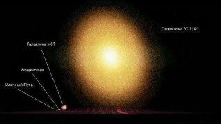 Галактика IC 1101 удалена от Земли на расстояние в 1.07 миллиардов световых лет и имеет диаметр около 6 миллионов световых лет.
