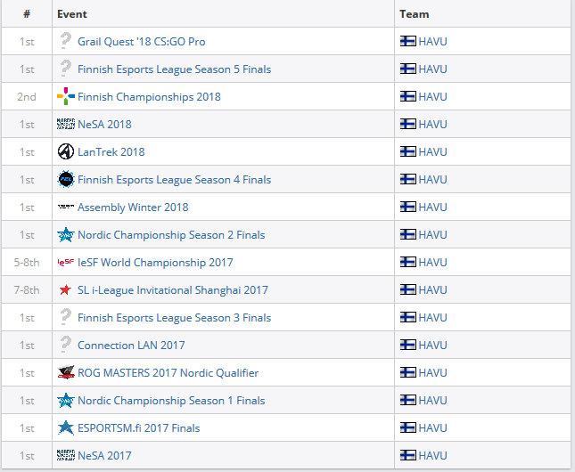 Она занимает 45-е место в рейтинге. Counter-Strike – удивительная игра. Финская команда HAVU отличилась тем, что выиграла 13 LAN-турниров из 16. Но что интереснее, однажды у нее получилось выиграть 3 LAN-турнира и 25 тысяч долларов призовых за 2 дня: Дело в том, что в Финляндии Counter-Strike достаточно популярен, и в течение года там проводится множество небольших региональных LAN-турниров и событий международного уровня для тир-2 и тир-3 команд. В том составе HAVU выступали Aleksib и Sergej, ныне игроки Ence. Последнему тогда было лишь 15 лет.