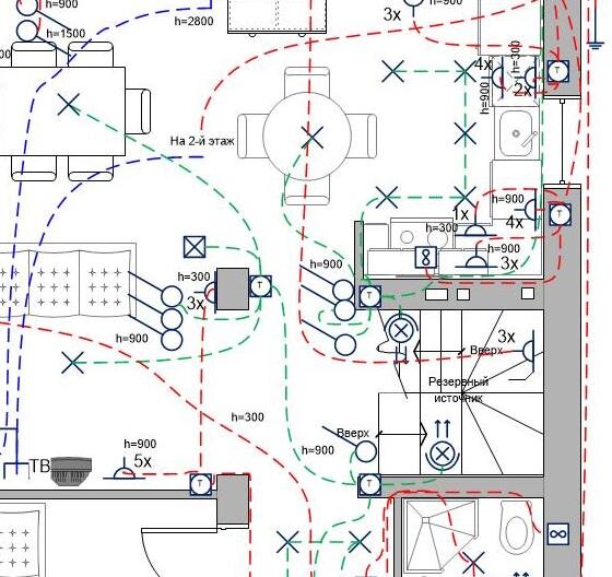 Определяем места установки распределительных щитков. Выбираем малозаметные "закутки", подсобные помещение, но не санузлы. Обозначаем где будут установлены розетки и выключатели. Выключатели располагаются на высоте 0,9 метров от уровня "чистого пола", розетки - 0,3 метра, исключение составляют розетки над столешницей кухни и над столами - 0,9-1,2 метра (позаботьтесь чтобы столешница кухни не перекрыла розетки). Выключатели ставятся в районе входа в помещение, розетки в предполагаемых местах подключения электроприборов. Предусмотрите розетки для холодильника, посудомоечной машины, вытяжки, духовки, кондиционеров. Конечно, предварительно нужно определиться с расположением мебели. Не экономьте на розетках, установите их даже там, где пока не планируете их использование. На каждые 2-3 метра стены предусмотрите хотя бы одну розетку. Самый большой спрос на электророзетки на кухне в районе столешницы. На лестницу рекомендую установить светильники с датчиками движения и освещенности вместо выключателей.
