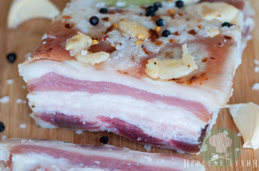 Во многих странах есть свои национальные сорта сала – лардо, бекон, панчетта и многие другие. Кажется, что почти каждая культура имеет свой собственный способ засолки сала. Ну и конечно же украинское сало которое является национальным блюдом Украины. Там есть музей сала с рестораном на территории отеля, в котором присутствует сало в каждом пункте меню - даже в десертах. Как вам такое? Каждая семья в Украине делает сало по-своему по рецепту, который из поколения в поколение передавался в семье от отца к сыну. Ключ к хорошему салу - это очень хороший и очень свежий кусок свиного сала с прослойкой мяса. Вот в принципе и весь секрет :). А засолить такой кусок сала можно разными способами, но сегодня я покажу самый простой способ, которым пользовались мои украинские предки. Ингредиенты: 1 кг. свиного сало с прослойкой 2 стакана морской соли немного лаврового листа и перца горошком горсть зубчиков чеснока 2 ч. л. хлопьев красного перца Приготовление: 1. Положите сало на разделочную доску и д