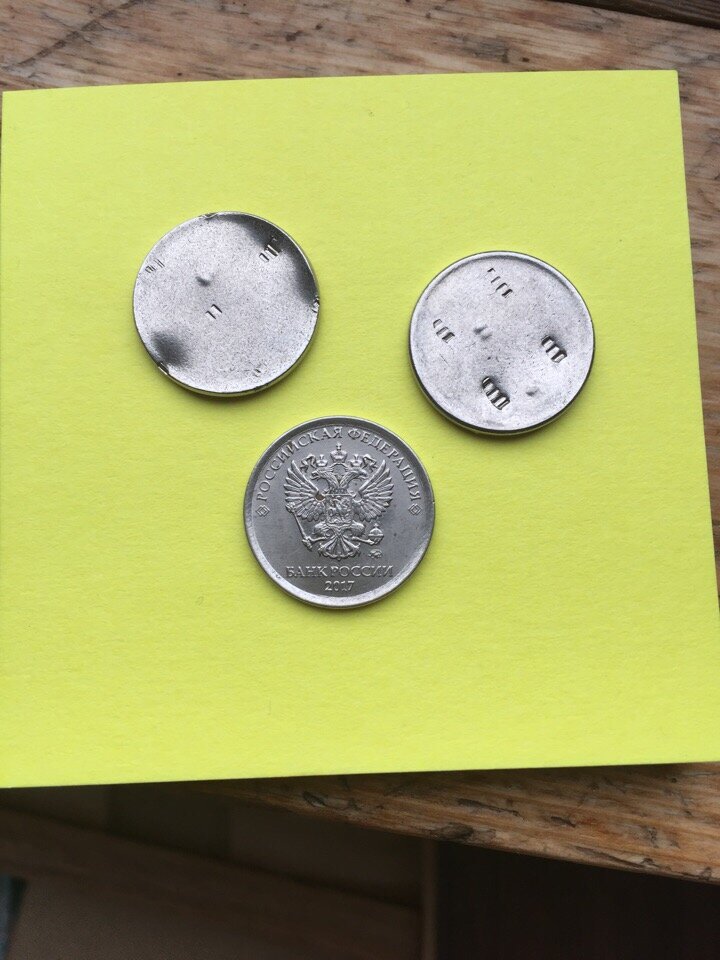 Коллекционеры и нумизматы охотно собирают не только редкие и бракованные монеты, но и то чем монеты являются до чеканки. То есть заготовки. Процесс чеканки монет происходит следующим образом: сначала из огромного листа вырубают заготовки (просто кружки), потом их отправляют на обжим по гурту и под чеканочные штемпеля. В результате таких манипуляций и появляются всем привычные монеты. Как я уже говорил выше, сами заготовки тоже пользуются спросом. Есть чистые заготовки и гашенные. Сейчас объясню, что это значит. Приобрел недавно в интернете гашенные заготовки. На фото - это два верхних кружка, рубль снизу - только лишь для сравнения. Что можно понять из этого фота? Заготовки вырублены, но не прошли стадию чеканки. Их "загасили", поэтому видим на них стороннюю механику. Дело в том, что если в партии монет обнаруживают брак, то вся партия подлежит на переплавку. Так же и с заготовками: нашли в партии заготовок брак - они должны уйти на переплавку. Но перед тем, как отвезти с монетного дв