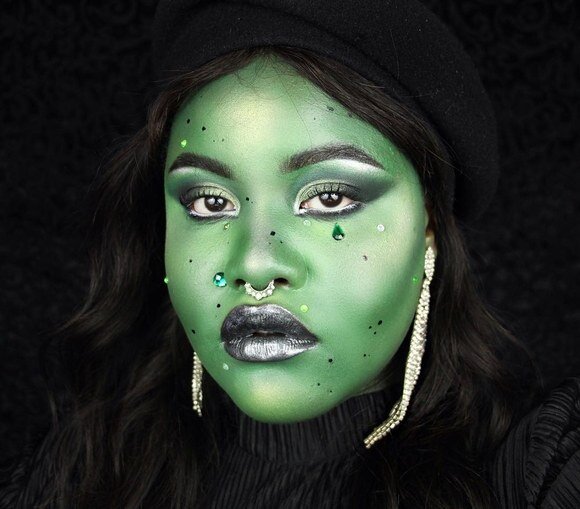 Когда еще можно сделать самый отвязный мейк, как не на Хэллоуин? Тем более, ночью 31 октября это вполне разрешено. Для создания образов можно использовать самую обычную косметику. Единственный момент – понадобиться ее намного больше обычного. Помимо всевозможных теней, жидких блесток и косметических карандашей также стоит запастись стразами, блестками и разными аксессуарами. А какой образ примерить на себя в День всех святых, мы сейчас и рассмотрим. Зеленая ведьма Да, теней зеленого цвета придется извести немало. Чтобы сделать такой мейк, можно просто раскрошить полбанки зеленых теней и смешать их с небольшим количеством тонального крема. Хорошо подойдет для этой цели и пигмент зеленого цвета. После окончания макияжа глаз и нанесения зеленого тона можно приклеивать стразы. Девочка-змейка: просто и со вкусом Кто хорошо владеет кистью и красками, может превратиться в Еву-искусительницу, сделав такой мейк. Здесь, как и в последующих образах, желательно запастись необычными линзами д