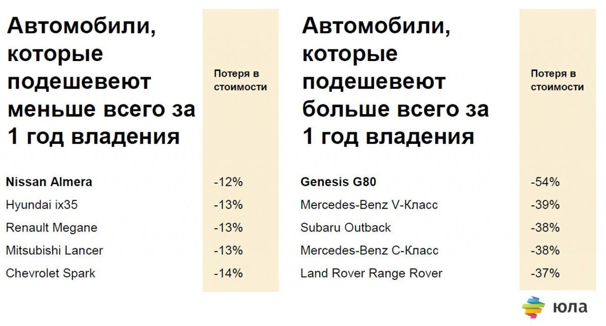 Популярный сервис объявлений «Юла Авто» рассказал о динамике изменения цен на подержанные автомобили в течении 3 лет с момента выпуска, основываясь на своей базе объявлений.