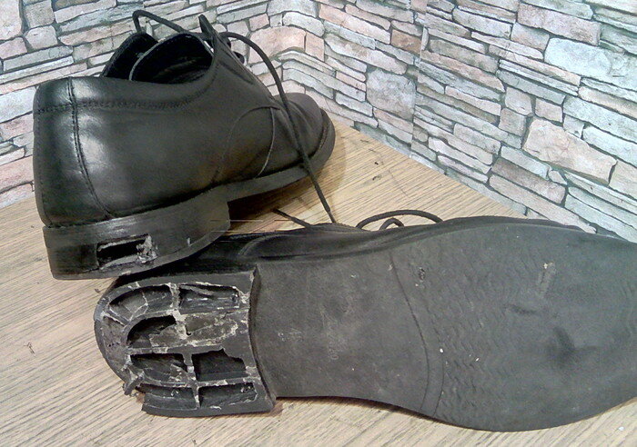 Здравствуйте, уважаемые читатели! Давайте сегодня рассмотрим достаточно распространённую тему растрескивания пластмассовых каблуков на мужской обуви. Думаю, случалось у многих. То же крупно: Такой тип каблука ставят и на достаточно дорогую обувь. При покупке каблук выглядит строго и красиво, у него на урезе такие рельефные полосочки вдоль, как от обработки кожи или дерева. Самое интересное, гарантию в 30 и даже в 60 дней они обычно выхаживают. А дальше... Если не следить и не заменить вовремя набойку, она снашивается до нуля, и особо удачный камушек выламывает наружную перегородочку. Ну и далее по частям. Если озаботиться набойками заранее, нужно найти мастерскую, где на такой каблук её делают. Есть мастера, которые набойки на такие стараются не ставить. А выбор каблуков для мужских следующий: Здесь мы видим: с формованной ходовой поверхностью (относительно недавно появились, у нас, по крайней мере), деревянные (какая-то прессованная масса склеена слоями, причём они самые дорогие),