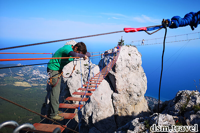 Пройдя первый мост вы оказываетесь на живописном пятачке одного из зубцов Ай-Петри. Перед вами откроется великолепный вид на море, живописную гору и огромное количество зевак собравшихся на вас смелых посмотреть. Если к этому времени у вас еще не сработал инстинкт самосохранения, то вы сможете всю красоту обозреть и сфотографировать! Если уже колени стали ватными, а руки цепкими, значит вы готовы преодолеть второй мостик и вернуться на «большую землю». Мостики немного раскачиваются от ветра и от впереди и позади идущих людей. Успокоить и остановить это движение невозможно. Поэтому не переживайте сильно. Вы свой выбор уже сделали и пройти ваш путь можно только вперед! Удачи!