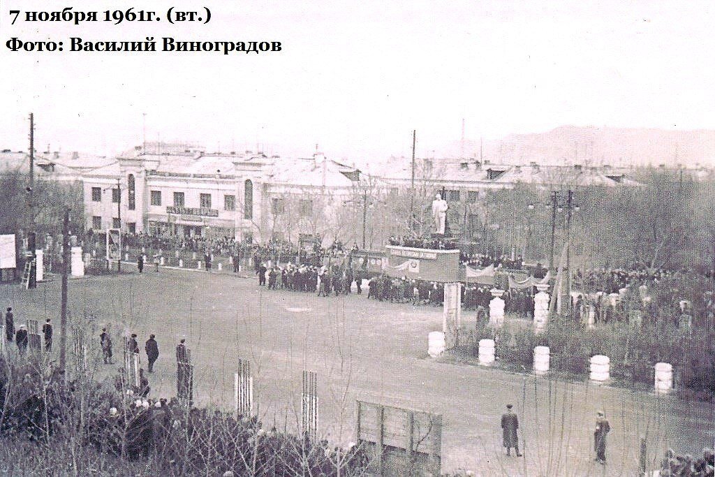 Вот он, городок моего детства, Коркино. В 1961 году меня еще не было. Но я помню его именно таким. Этот снимок сделан наверняка с крыши или с углового балкона третьего этажа нашего дома. На заднем плане - магазин "КУЛЬТОВАРЫ". Предмет вожделения всех ребят нашего двора. Особенно перед Новым годом. Деревянные застекленные прилавки, за которыми... А вот парадную трибуну мы не любили. Подняться туда было можно, никто не закрывал, но пахло там... фекалиями и мочой. Ненароком и на "мину" можно было наступить. Буквально рядом с нашим домом были двухэтажки, напротив которых - сарайки и погреба. В сарайках держали на откорм свиней, перед осенним призывом в армию их кололи. Однажды крупненький такой боров сорвался и побежал прямо в Банковский переулок (вход в него на фото справа, внизу, рядом со щитом). Парень-призывник, на которого заглядывались все девчонки нашего двора, помчался за ним, оседлал и, держась за уши свиньи, выехал на эту самую центральную тогда площадь города. Верхом. А еще я