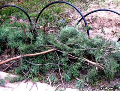 Материалом для искусственного укрытия служат сухой песок, торф, сухой лист, лапник или еловые ветки (лучший материал), перегной, соломистый навоз и т. д. Кроме того, иногда над растениями устраивают деревянные перекрытия, которые заваливают листом, навозом и т. д. Однако, какие бы виды защиты ни применялись, растениям должен быть обеспечен доступ воздуха, при отсутствии которого они могут погибнуть.