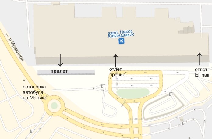 В сторону Агиос Николаос (через Малию, Сталиду и Херсонису) ходят хорошие современные автобусы, с местом под багаж (до Агиос Николаос 8 евро, до Малии 4 евро), поэтому в эти города можно легко добраться без такси (до Агиос Николаоса такси стоит примерно 100 евро), хотя и несколько дольше (такси идет до Малии минут 20, автобус около часа). От выхода из аэропорта до остановки автобуса надо пройти примерно 50 метров. В другие направления (например до Ретимно или Ханьи) на автобусе добираться менее удобно: нужно доехать до автовокзала Ираклиона и там пересесть на нужный автобус. Для ориентирования все остановки пронумерованы. Например, Херсонису тянется с 20 остановки (супермаркет «Халкиадакис») до 24 (Стар Бич). Подробное расписание движения автобусов висит на каждой остановке, но на самом деле автобус может прийти на 5-10 минут раньше (особенно вечером, когда нет пробок в Херсонесу и Малии) или на 10-15 минут позже. Автобусы ходят часто, а такси на дороге практически не поймаешь: они гнездятся в специально отведенных местах (в целом вполне удобно расположенных для туристов).