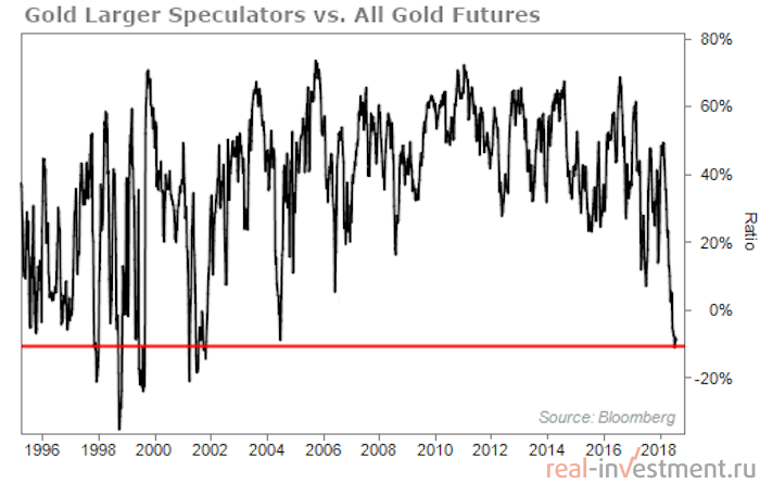 Сейчас крупные спекулянты делают максимальную ставку против золота (относительно общего объема ставок) с 2001 года. Посмотрите на график: