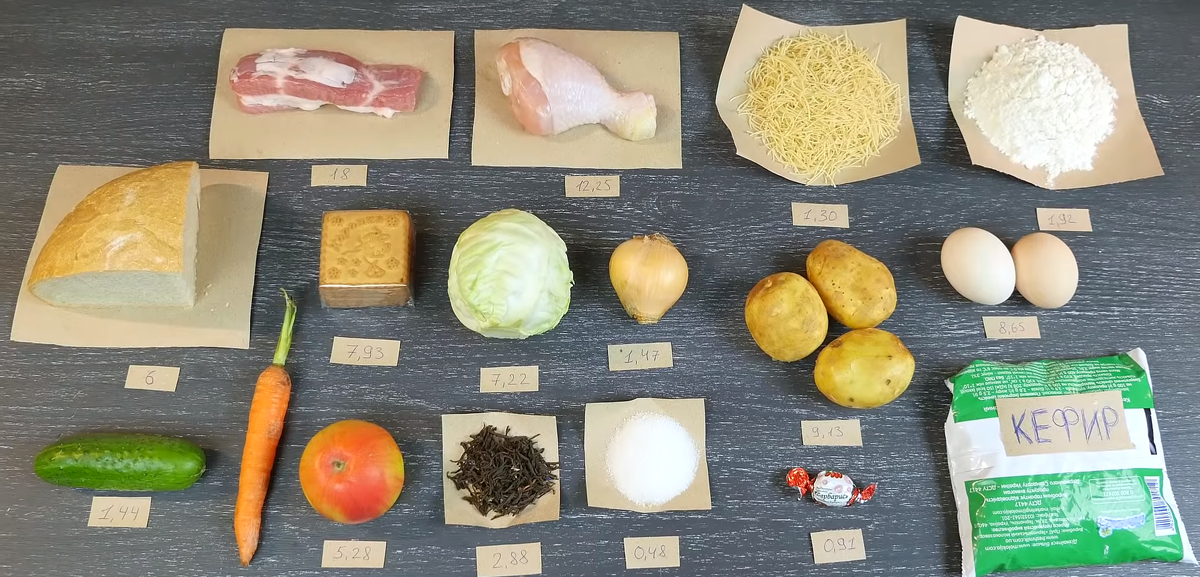 Представьте,что вы остались дома в котором нет еды,а есть только соль и 100 рублей на которые вам нужно прожить целы день,питаясь при этом максимально разнообразно и полезно.Брать будем всё по минимуму. В нас список покупок входит:мука,макароны,1 куриная ножка,кусочек мяса,маленькая часть хлеба,5 печенюшек,маленькая капуста,луковица,три картошки,два куриных яйца,0.5л кефира,немного чая с сахаром,одно яблоко, одна морковка, один огурец и ещё одна конфетка.Сложив все ценны получилась сумма около 100 рублей.Это всё мы купили в недорогих супермаркетах, в которых продают муку,сахар и макароны на развес.Удалось даже найти развесной чай, а хлебушек нам отрезала продавщица Завтрак Берём пару ложек муки,немножко сахара по вкусу, забиваем одно яйцо и залить пол стаканом кефира Взбиваем смесь до однородной массы.Берём мясо и аккуратно отделяем от него сало. Теперь ставим сковороду на плиту, т.к у нас нету масла,то мы надеваем кусочек сала на вилку и проводим им по нагретой сковороде,сало выде