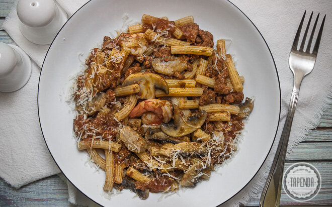 Приготовление болонского соуса требует времени, поэтому мы всегда готовим его в больших количествах, затем порциями замораживаем и используем соус, когда нам это нравится. В основном, такой соус мы используем в макаронных блюдах. На этот раз мы добавили грибы и несколько креветок в соус. Кстати, о приготовлении соуса расскажу в следующем посте! Ингредиенты: чеснок - 1 головка креветки - 10 шт макароны - 160 г масло - 10 столовых ложек пармезан - по мере необходимости грибы - 100 г перец - по вкусу соус - 300 мл соль - по вкусу вода - 50 мл Очистите грибы и нарежте их ломтиками. Если у грибов хорошая кожица, вы можете оставить ее. Добавьте оливковое масло и чеснок в кастрюлю. Когда чеснок автоматизирует масло, удалите его. Теперь добавьте нарезанные грибы. Добавьте воду и соль и специи по вкусу. Теперь добавьте болонский соус. Когда соус станет теплым, добавьте очищенные креветки. Через 3-4 минуты соус будет готов. Приготовьте макароны в соответствии с инструкциями на упаковке, добавь