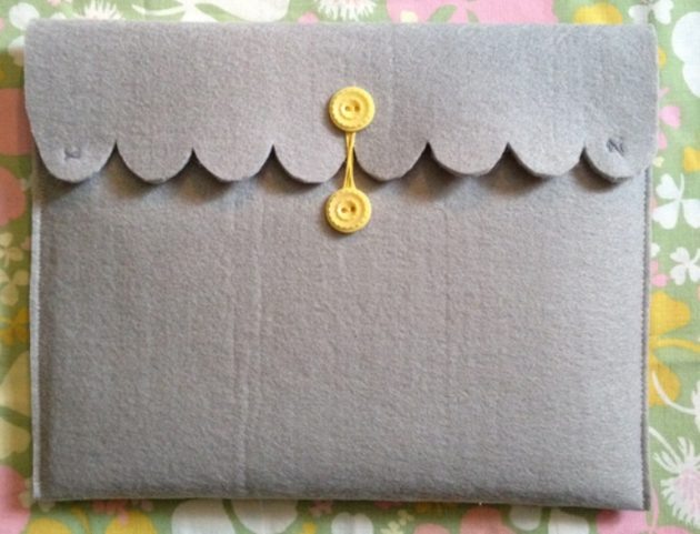 Этот чехол станет отличным подарком на праздник для человека, который ни на секунду не расстается со своим гаджетом. По аналогии можно смастерить и чехол для телефона. Чтобы изготовить подарок, нужно будет заранее, втайне от одариваемого, измерить размеры устройства. Требующиеся материалы: · кусок фетра; · 2 декоративные пуговки; · вшиваемые магниты; · плотные нитки, соответствующие цвету пуговиц; · нити, соответствующие цвету фетра; · игла и ножницы. Ткань складывается таким образом, чтобы ее нижняя часть была немного более длинной, чем верхняя – это будет крышка для чехла. Затем следует прошить изделие по краям и вывернуть его. Край крышки обрезается волной. Посередине пришивается пуговка. Вторая крепится на самом чехле. Между ними делается петля. С обеих сторон крышечки вшивается по одному магниту. Стильный подарок готов.