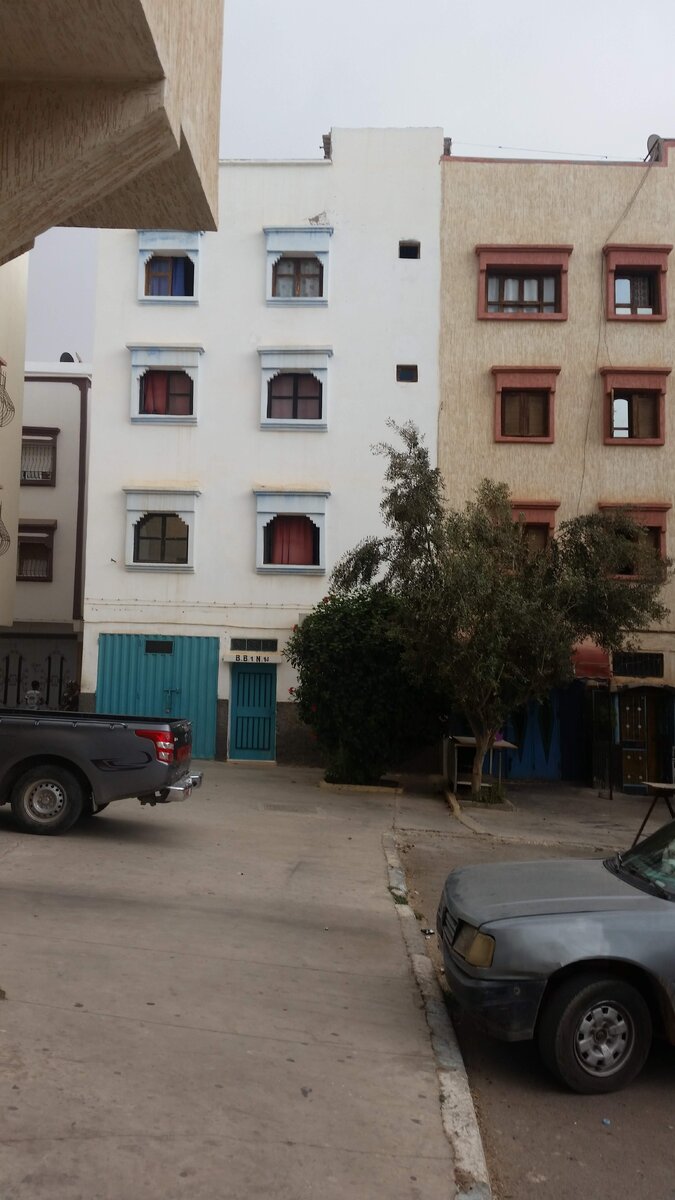 Я вернулась с новой историей про Марокко))) Ниже на фото дом, в котором я снимала комнату. Ну как комнату, соседей больше не было и за почти даром я сняла всю квартиру (что очень удобно в плане чистоты и личного пространства). Так называемый первый этаж, ну окошки над дверью, и есть моя квартира. По высоте она находится на уровне российского третьего этажа (ну или если быть точной, то чуть выше второго). На первом этаже практически каждого дома располагается магазин, или гараж, любое не жилое помещение (в основном магазин). Так с торца моего жома был компьютерный зал со снеками в продаже, где работал хозяин квартиры. Сам он со своей семьей жил на этаж выше, кто еще выше - не знаю. Очень интересный "подъезд" в доме: это отдельная лестница - спираль с одной дверью на этаж, то есть вы открываете синюю дверь и направо сразу лестница, где самые маленькие окошки. Как я говорила, на этаже одна квартира, по нашим меркам двухкомнатная, но с крохотным закутком для готовки, и залом (там он зоветс
