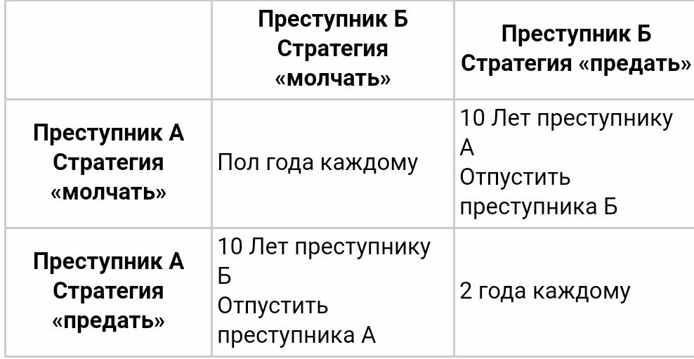Как мне кажется, смысл теории игр проще всего пояснить на «Дилемме заключенного», классическая формулировка которой звучит так: «Двое преступников, А и Б, попались примерно в одно и то же время на сходных преступлениях. Есть основания полагать, что они действовали по сговору, и полиция, изолировав их друг от друга, предлагает им одну и ту же сделку: если один свидетельствует против другого, а тот хранит молчание, то первый освобождается за помощь следствию, а второй получает максимальный срок лишения свободы (10 лет). Если оба молчат, их деяние проходит по более лёгкой статье, и они приговариваются к 6 месяцам. Если оба свидетельствуют против друг друга, они получают минимальный срок (по 2 года). Каждый заключённый выбирает, молчать или свидетельствовать против другого. Однако ни один из них не знает точно, что сделает другой. Что произойдёт?» Представив игру в виде матрицы мы получим: А теперь представим развитие ситуации, поставив себя на место заключённого А. Если мой подельник м