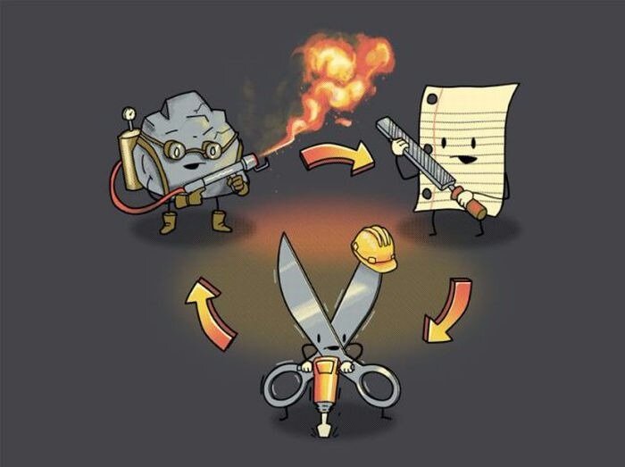 Рассмотрим другие игры на предмет равновесия. Например, в «Камне, ножницах, бумаге» нет равновесия по Нэшу: во всех ее вероятных исходах нет варианта, в котором оба участника были бы довольны своим выбором. Тем не менее, существует Чемпионат мира и World Rock Paper Scissors Society, собирающее игровую статистику. Очевидно, что вы можете повысить свои шансы на победу, если будете что-то знать об обычном поведении людей в этой игре. По данным World RPS Society, камень является самым часто выбираемым ходом (37,8%). Бумагу ставят 32,6%, ножницы — 29,6%. Теперь вы знаете, что нужно выбирать бумагу. Однако, если вы играете с тем, кто тоже это знает, вам уже не надо выбирать бумагу, потому что от вас ожидается то же самое. Есть знаменитый случай: в 2005 году два аукционных дома Sotheby«s и Christie»s решали, кому достанется очень крупный лот — коллекция Пикассо и Ван Гога со стартовой ценой в 20 миллионов долларов. Собственник предложил им сыграть в «Камень, ножницы, бумагу», и представител