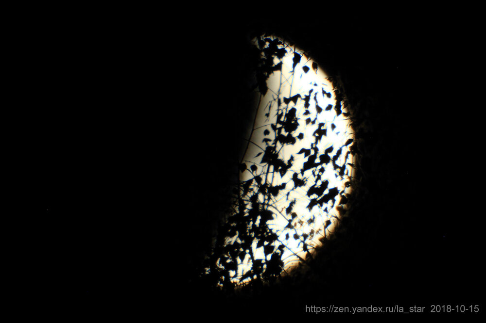 1) Ну первый снимок, как всегда - мимо фокуса. Куда-то там я сфокусировался, но не туда )) 2) Потом перефокусировался нормально, но.. К сожалению, Луна сегодня низко и уже уползала за деревья. Я сначала не мог понять - что за брак такой выходит на фото? Вот такой: 3) Потом до меня дошло, что это тонкие ветки от елки все размывают. Но к этому времени уже там и береза вмешалась, Луна уползала все дальше вглубь зарослей... Стало совсем плохо. 4) Но тут в голову заскочила мысль - а не поснимать ли "художку"? Очень уж интересно на мониторе фотика выглядело это все, пока я крутил фокусировку. Да и самый первый снимок какой-то интересный получился. Дай, думаю, попробую - а вдруг получится что-то симпотное? Перефокусировался на листья - и вот!!