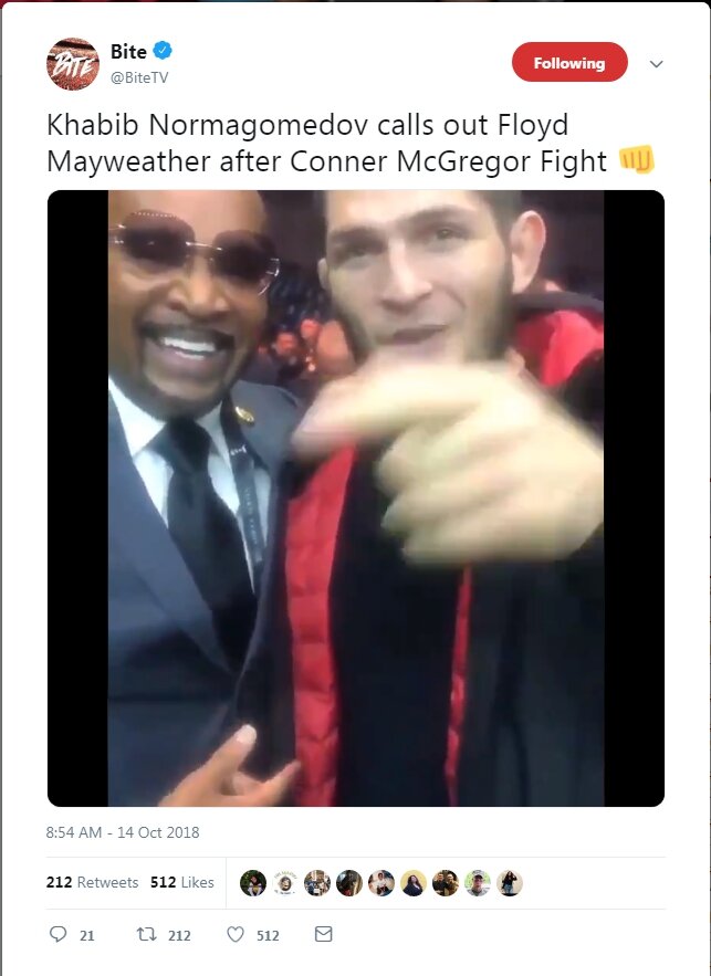 «Эй Флойд, давай сделаем это, нам нужно это сделать. 50-0 против 27-0, два бойца, которые никогда не проигрывали. В джунглях есть только один король, и этот король я, потому что у тебя не получилось уронить Конора, а я легко это сделал. Так что готовься!» - сказал Хабиб в своём обращении.