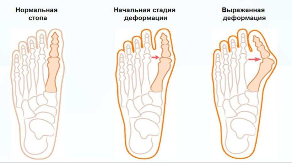 Но чаще всё-таки шишковидные образования на больших пальцах ног вызваны обычным поперечным плоскостопием. Эта деформация стопы из-за недостаточной прочности связочного аппарата при неправильной нагрузки на стопу начинает с возрастом прогрессировать. При этом происходит постепенная деформация большого пальца стопы: он отклоняется в сторону и искривляется, а его основание выступает в виде шишки или косточки с внутренней стороны стопы. Такое изменение носит название hallux valgus, или вальгусная деформации - одно из самых распространённых заболеваний стопы.