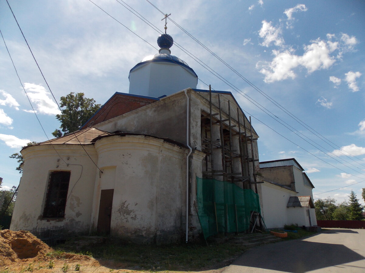 Ныне существующее каменное здание построено в 1881 году, в советское время храм был закрыт, была демонтирована (снесена) колокольная ротонда, а само здание было переоборудовано под сельский клуб. Во время нашего посещения (июнь 2015 года) храм был на реставрации. За храмом находится часовня Пройдя чуть дальше и обернувшись назад можно увидеть храм и часовню Подходим к памятному кресту Надпись на кресте гласит: