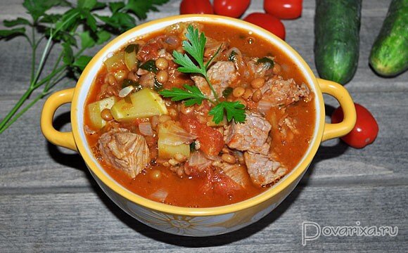Конечно, это блюдо можно приготовить когда угодно - при нынешнем-то изобилии овощей на прилавках в любое время года. Но только осенью, после сбора урожая, овощи так сочны, полны витаминов ароматны и вкусны. Кабаклама - блюдо вариативное, одни готовят его как густой суп, другие предпочитают тушить и ставить на стол как второе блюдо. Любопытно, что мясо в составе кабакламы обязательно, но вовсе не требуется подбирать для нее лучшие куски. Как раз наоборот, кабакламу часто делают из самых дешевых частей баранины или говядины. Сейчас станет понятно, почему. Чтобы получилось 4-5 порций, выкладываем на стол: Приправлять будем 2-3 столовыми ложками томатной пасты, сахаром, солью, перцами красным и черным, свежей зеленью. Как видим, ничего экзотического... если не считать гороха, который для большинства давно стал своим. Приготовленное для кабакламы мясо промываем и нарезаем, кладем в казан и заливаем немного кипятка - ровно столько, чтобы мясо могло в нем вариться до готовности. Теперь по