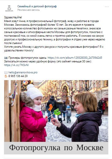 Стратегия №1 опиралась на УТП: Анна знает очень атмосферные места в Москве, может не только фотографировать, но и многое рассказывает про Москву, плюс очень быстро (в течение недели) отдаёт готовые фотографии и цены ниже, чем у конкурентов. Объявление запустили такое: