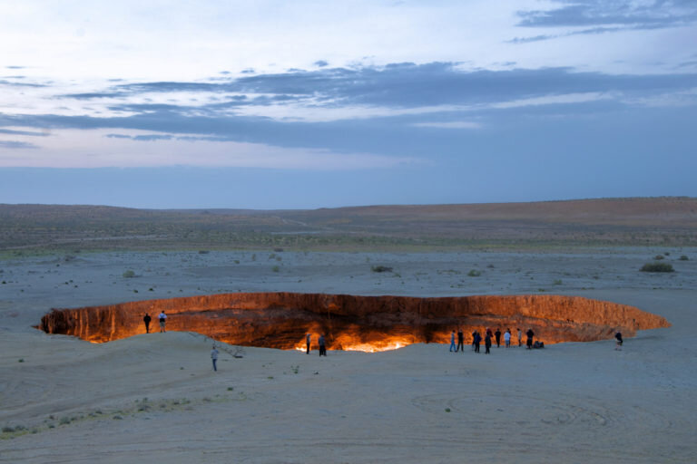 Огромную часть территории Туркменистана занимает пустыня. А большую часть национального благосостояния – природный газ. Особенного внимания заслуживает горящий кратер вблизи селения Дарваза. Этот газовый кратер является у туристов одним из самых популярных достопримечательностей. Вид пламени, который горит среди желтых песков пустыни интригует и завораживает даже повидавших уже многое путешественников. Но не все знают, как именно появилось это загадочное место, которое находится в 265 километрах на север от города Ашхабад. Газ, который вырвался из кратера, мог нанести реальную угрозу жизни людей и животных, которые находились поблизости, поэтому его решили поджечь. Геологи считали, что запасов газа там немного и через некоторое короткое время газовый кратер Дарваза погаснет, но ошиблись. Но шли дни, месяцы, годы и десятилетия, а газ не заканчивается и пламя продолжает полыхать. По самым приблизительным данным в кратере исчезли миллиарды кубометров газа. С 1971 года природный г