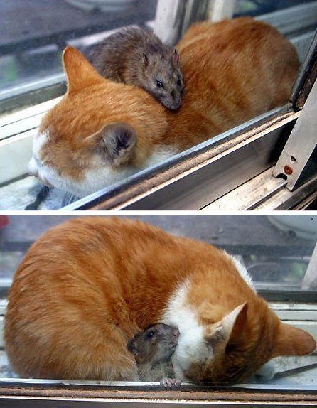 Все мы знаем мультипликационный фильм про кота Тома и мышки Джерри, которые больше 100 серий портят друг другу жизнь Мультфильм немного жестокий, не знаю почему его допускают в прокат на ТВ. Но так уж оно есть, и наши дети это смотрят. Но суть не об этом. Ниже вы можете наблюдать две фотографии настоящих друзей. Кошки и мышки. Они живут вместе, вместе едят и спят. Как это мило — все стереотипы к чертам собачим!!!