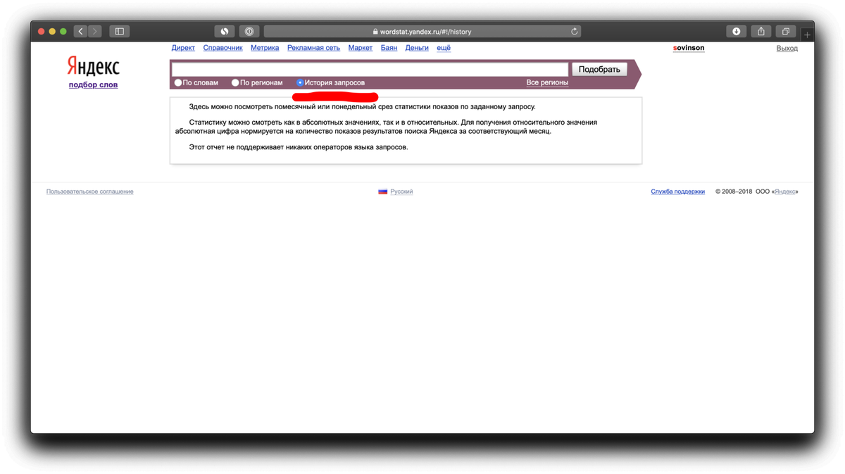 В первую очередь стоит обратить внимание на сервис https://wordstat.yandex.ru. Он максимально прост в использовании, при этом имеет возможность настройки и дает данные не только по динамике запросов, но и указывает конкретное количество запросов поисковых фраз. Нас интересует вкладка История запросов, которая позволяет просматривать помесячно или понедельно данные по количеству просмотров отдельных пользовательских запросов в рамках отдельно-взятого региона или страны. Так же, есть возможность просматривать срезы пользовательских запросов в зависимости от устройства.