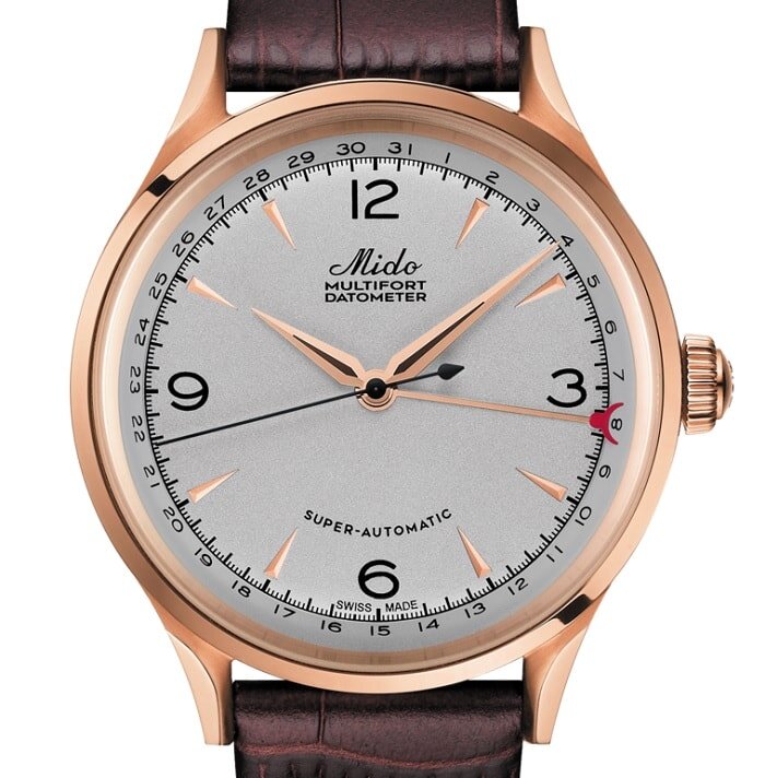В этом году часовой бренд “Mido” празднует свой 100-летний юбилей. В честь этого компания представила лимитированную модель “Mido Multifort Datometer Limited Edition”. Новинка практически полностью повторяет дизайн одной из флагманских моделей 1939 года с индикацией даты. Часы будут выпущены ограниченной серией 1918 экземпляров — в честь года основания компании. Корпус Круглый корпус диаметром 40 мм и толщиной 11,85 мм изготовлен из нержавеющей стали и обработан золотистым PVD покрытием. Поверхность корпуса — сочетание полированной и матовой отделки. Крупная заводная головка скругленной формы находится на правой стороне. Задняя завинчивающаяся крышка с прозрачным сапфировым стеклом. Водонепроницаемость корпуса 50 метров. Циферблат Серебряный циферблат с зернистой поверхностью сочетается с золотистыми стрелками и накладными часовыми метками (золотистое PVD покрытие). Разметка для минутной шкалы, для индикатора даты, арабские цифры и остальные надписи на циферблате нанесены черным цветом