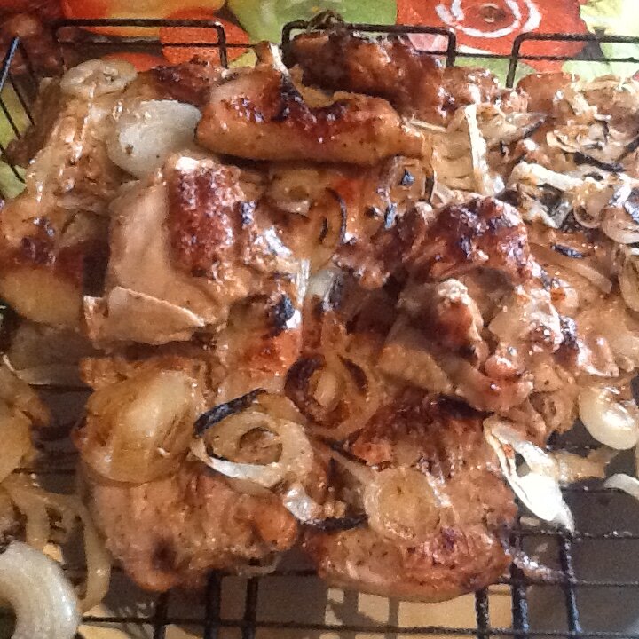 Лук нужно мариновать на курице, без всяких рецептов. Просто добавляем ингредиенты на свой вкус. И в этом видимо весь смысл, на лук всё добавить, а потом перемешать и помять немножко его руками и можно вмешивать в курицу.