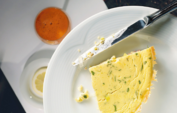 Ингредиенты Яйцо куриное 6 штук Лук-порей 1 штука Варено-копченая ветчина 100 г Сливочное масло 50 г Сметана 200 г Сливки 25%-ные 100 мл Мускатный орех по вкусу Сыр эмменталь 50 г Петрушка по вкусу Соль по вкусу Перец черный молотый по вкусу 1. Яйца взбить со сметаной, сливками, нарубленной петрушкой, мускатным орехом, солью и перцем. Результат смешать с тертым сыром. 2. Ветчину нарезать кубиками со стороной в полсантиметра и обжарить на сливочном масле до слегка золотистого цвета, после чего добавить нарубленный порей (только белую часть стебля) и жарить, пока порей не станет мягким. 3. Залить содержимое сковороды яичной смесью и отправить в духовку, разогретую до 180 градусов на двадцать минут. Проверить, чтобы омлет достаточно пропекся (любым тактильным способом — ложкой, вилкой, гигиенически безупречным пальцем), вынуть готовый омлет из духовки, дать ему несколько минут остыть, чтобы было удобнее резать на порции, и подавать к столу. Еще больше рецептов на сайте