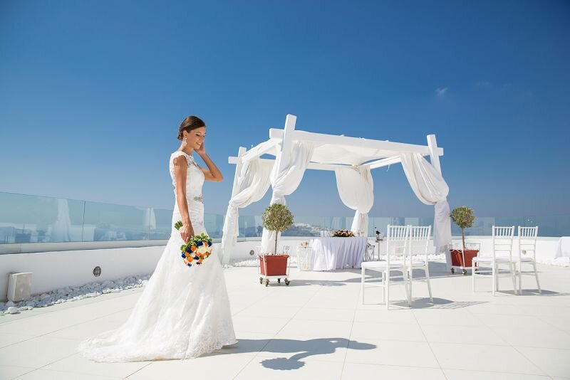 Никогда не знаешь, станет ли церемония в Греции на острове Санторини на свадебной площадке Santo Winery значимым событием только для двух влюбленных сердец или для всей мировой общественности. Причина тому – в ее богатой истории и неописуемой красоте. Когда-то на территории винных погребов Santo Winery построили просторную веранду. Расстилаясь над бескрайним синим морем и, открывая потрясающий вид на дремлющий вулкан, она обратила на себя внимание многочисленных молодоженов. Оформляется свадьба в Греции на Santo Winery в традиционных белых тонах, характерных для классического свадебного стиля. Именно такой запомнилась свадьба на Санторини на площадке Santo Winery петербургской пары Романа и Анастасии. Подробнее об организации свадьбы на Санторини смотрите по ссылке: Свадьба на Санторини Подробнее об организации свадьбы на площадке Santo Winery смотрите по ссылке: Официальная свадьба на Санторини на площадке Santo Winery