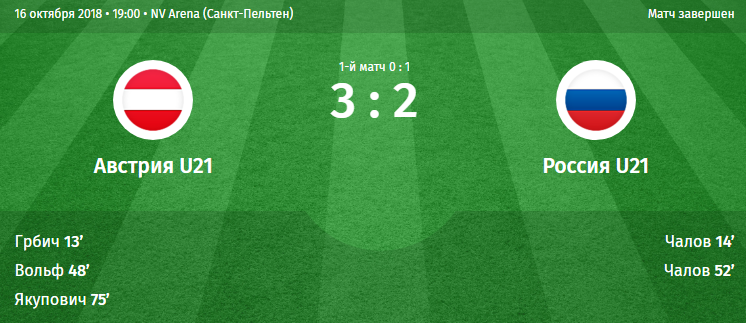 Молодежная сборная России проиграла команде Австрии в заключительном матче отборочного турнира Евро-2019 - 2:3. Команда Евгения Бушмановафинишировала третьей в группе 7 с 19 очками и не смогла отобраться в финальную стадию турнира. Молодежная сборная России также не выступит на Олимпиаде-2020. Источник: СЭ