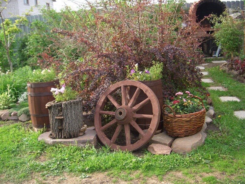 Чтобы создать на своем приусадебном участке сад в стиле кантри, вдоль дорожек, на газоне, у скамеек или в местах, открывающихся с определенной точки обзора, поставьте керамических зверушек. Или сделайте фигурки своими руками. К примеру, можно на газоне разложить бабушкины глиняные или чугунные горшки. При желании подкрасьте их, чтобы блестели на солнце.