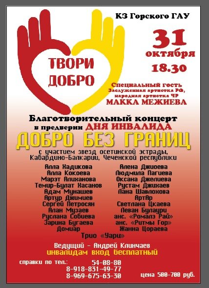 ДРУЗЬЯ 31-го числа в ГГАУ благотаорительный концерт!!! 💥 П Р И Х О Д И Т Е !!! 1)Алла Хадикова 2)Андрей Клинчаев 3)Макка Межиева 4)Марэт Алиханова 5)Темир-Булат Хасанов 6)Адам Мунашев 7)Артур Джимиев 8)Сергей Петросян 9)Алан Музаев 10)Руслана Собиева 11)Зарина Бугаева 12)Домиар 13)Алена Джиоева 14)Людмила Пагиева 15)Трио Уари 16)Оксана Джелиева 17)Рустам Джихаев 18)Лана Шавлохова 19)АртАр 20)Светлана Цкаева 21)Леван Булаури 22)Ромалэ Рай 23)Ритмы Гор Карсанов 24Жанна Цораева 🔝🔝🔝 ВСЕ ДЕНЬГИ ПОЙДУТ НА БЛАГОТВОРИТЕЛЬНОСТЬ!!! 100% ИНФОРМАЦИЯ. Помогайте!!! Приходите! 🔝Топовые артисты🔊 знаменитые хиты!!! 💥 Специальный гость Макка Межиева😍 😎