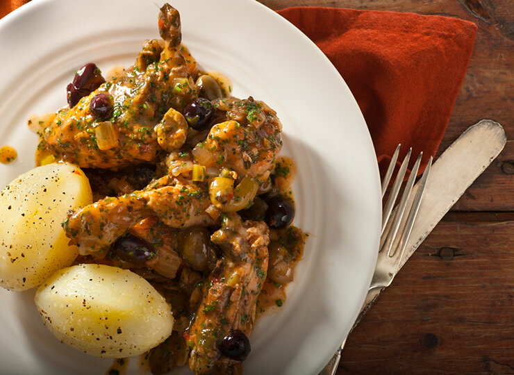 Это тушеное блюдо имеет приятную соленость от маслин, которые хорошо сочетаются с полентой, картофельным пюре или просто отварным картофелем. При приготовлении этого блюда убедитесь, что вы используете высококачественные оливки. Ингредиенты 4 порции 1 цельный цыпленок (от 1,5 до 2 килограммов, разрезанный на 16 штук) или 2 килограмма куриных бедер