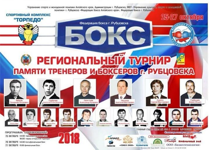 25-27 октября в Рубцовске, на базе спортивного комплекса «Торпедо» пройдет региональный турнир по боксу памяти тренеров и боксеров г. Рубцовска. Соревнования стартуют 25 октября в 14:00, а торжественный парад открытия состоится в 18:00 26 октября бои между участниками начнутся в 14:00, а в заключительный соревновательный день начало финальных поединков запланировано на 11:00.