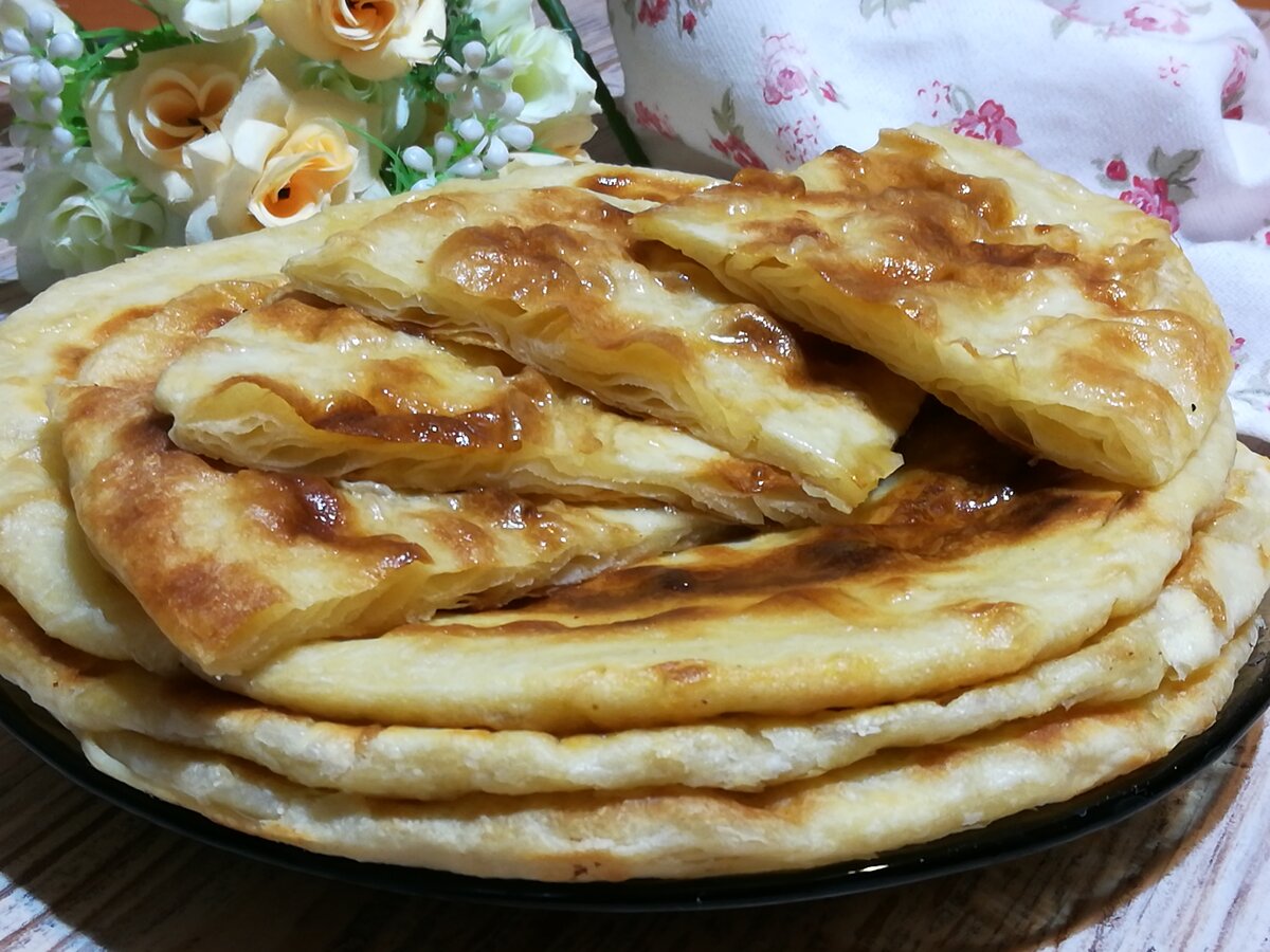 Это ещё один рецепт лепешек... Рецепт очень простой, здесь нет дрожжей, не нужно добавлять яйца, всего лишь мука, молоко и вода... И, тем не менее, это необыкновенно вкусные и очень-очень слоёные лепешки. Для приготовления 4 больших лепешек потребуется: Один полный стакан молока и воды, то есть 50 на 50; Мука 330-350 грамм Пол чайной ложки соли Примерно 60 г сливочного масла Растительное масло 1 столовая ложка Готовим: Берём миску для замеса теста, просеиваем в неё муку, 1 столовую ложку убираем, это на домес. Кладем соль (лучше мелкую) и перемешиваем их между собой. Теперь жидкая составляющая... Вливаем полстакана молока, и полстакана воды, и замешиваем тесто. Тесто получается мягким, даже немного липким, но, при этом должно держать форму, то есть его можно будет собрать шар. Накрываем тесто полотенчиком или заворачиваем в мешочек и оставляем на столе минут на 20-25. Тем временем, берем сливочное масло, нарезаем его кусочками и растапливаем в микроволновке, затем вливаем в него рас