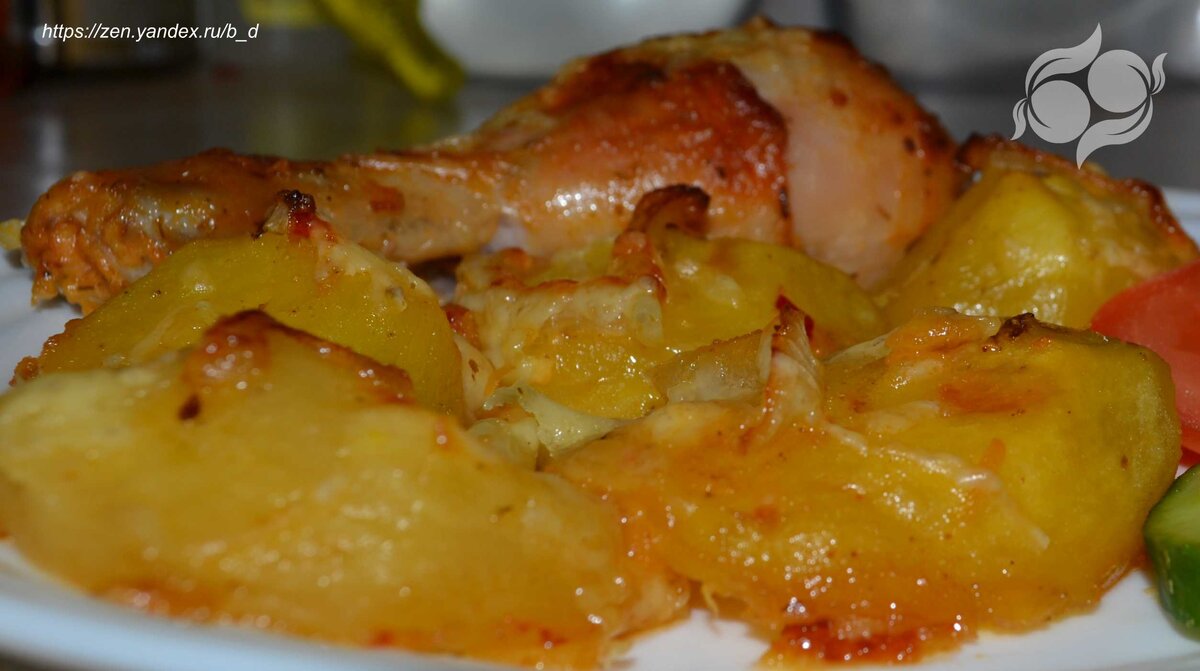 После работы заехал в магазин. Очень хочется кушать. Проходя мимо прилавков и витрин "выделяется слюна" от готовой продукции; курица гриль, салаты, выпечка и другие продукты. Но я решил не поддаваться искушению и купил только свежемороженые окорочка. Надо сказать, что куриные окорока оказались хорошо обработанные, без хребта и попки, свежие и красивые на вид. Решил я приготовить ужин сам и ни чуть не пожалел!!! Делюсь с Вами не рецептом а кулинарной импровизацией голодного человека! Нам понадобится: * Куриные окорочка 5 шт. * Майонез и аджика. * 1 зубчик чеснока. * Лук одна средняя головка. * Картофель 5 шт. * Соль по вкусу. * Сыр. * Растительное масло 1 столовая ложка. Приготовление: * Окорочка промыть и разрезать на две части, бедро и голень. Поместить их в глубокую чашку. * На мелкой терке натереть чеснок. Добавить столовую ложку аджики (не острая) и майонез 2-3 ст. ложки. Посолить по вкусу, хорошо перемешать и оставить мариноваться. * Противень смазать растительным маслом (1 ст.