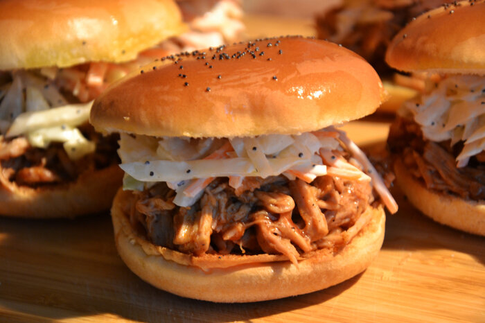 Сборка! На нижнюю часть булочки кладем мясо, не жалея, сверху коул-слоу и закрываем все верхней частью булочки. Откусываем и вспоминаем детство на ферме в Техасе, когда трава была зеленее, птички щебетали красивее и на пивное пузо не было даже намека.