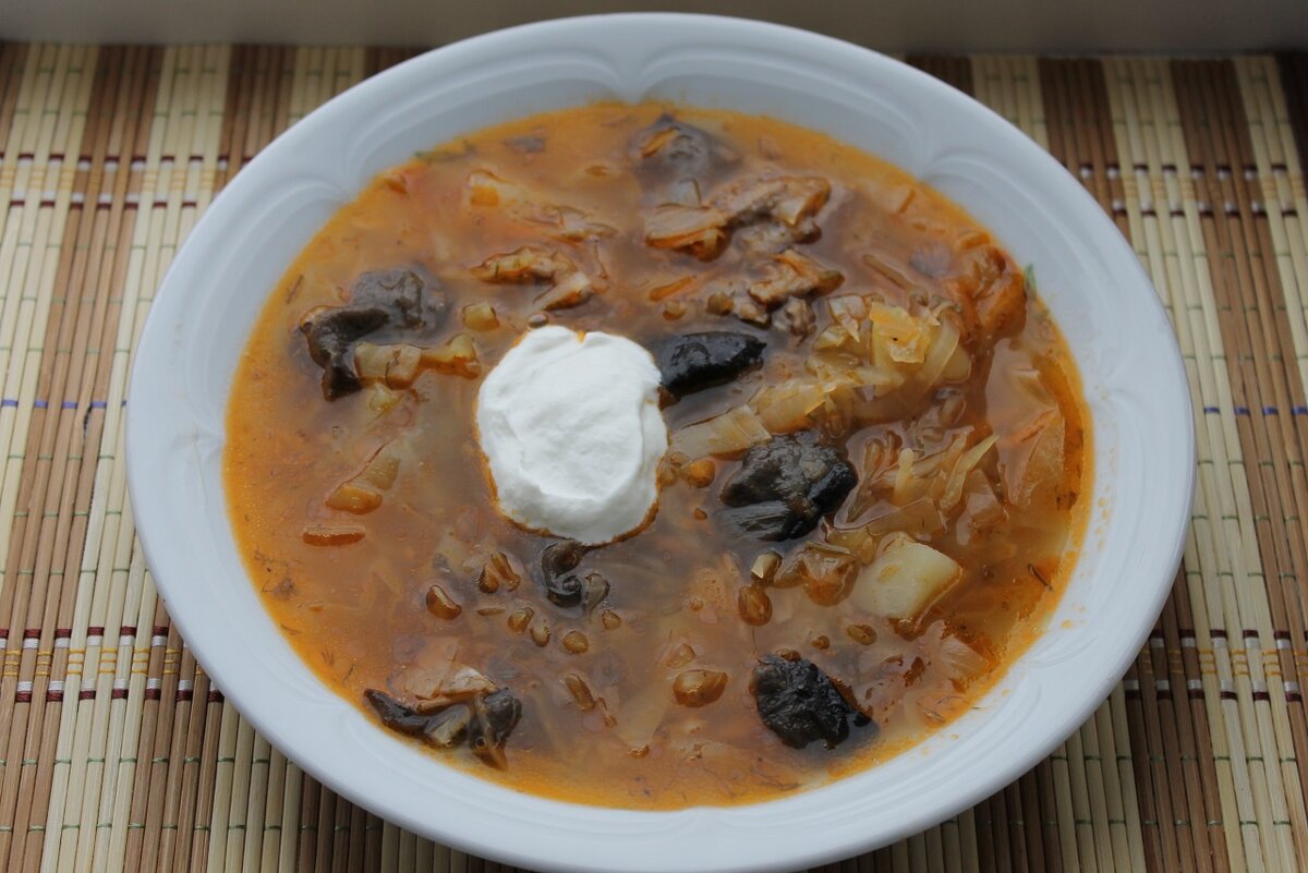 Это блюдо очень популярно на Украине и в Польше, где грибы также любят и ценят. Ингредиенты: Способ приготовления: Если готовите щи из сушеных грибов, то их нужно предварительно замочить в воде. Лук, морковь и картошку почистить, лук порезать мелкими кубиками, морковь натереть на терке, а картофель порезать средними кубиками. Капусту мелко нашинковать. Воду ставим на огонь и в это время обжариваем на растительном масле картофель до состояния полуготовности. Как только вода закипела, убавляем огонь и опускаем туда картофель. Мелко нарезанный лук и морковь обжариваем в той же сковороде, где готовили картофель до золотистого цвета, добавляем томатную пасту, перемешиваем и тушим ещё 2 минуты. Затем обжаренные овощи и нашинкованную капусту отправляем в кастрюлю к картофелю. Добавляем нарезанные грибы. Солим и перчим суп и варим в течении 12 минут на медленном огне под закрытой крышкой. После чего суп можно подавать к столу, украсив зеленью и добавив сметаны. Эти щи можно есть, как