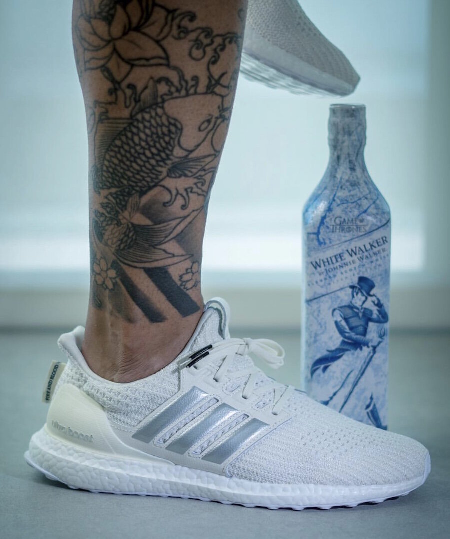 Кроссовки adidas UltraBoost белого цвета, посвященные дому Старков из сериала Game of Thrones, на самом деле оказались из дома Таргариенов. Как оказалось, белый цвет - это "Queen Daenerys", а не "Stark White". Дьявол всегда кроется в деталях. Вот и тут он всех запутал. На предыдущей фотографии был только общий план, но теперь можно разглядеть элементы - вот на шнурках указан дом Таргариенов. Девиз дома - "Пламя и кровь". И вот он - на задней бирке. Ну и трёхглавый дракон - символ дома. Обычно он изображается красным на чёрном фоне. Но в данном случае у нас цвета Дейнерис Бурерождённой - белокурой кхалиси. Впрочем есть вариант UltraBoost и в традиционных цветах дома Таргариенов. Эта версия кроссовок получила имя "House Targaryen Dragons" и будет выглядеть так: огненный и чёрный цвета. Девиз дома на пятке, драков на язычке. Так что фанатам есть из чего выбрать. *** Вам какая пара больше по душе? Не стесняйтесь высказываться в комментариях.