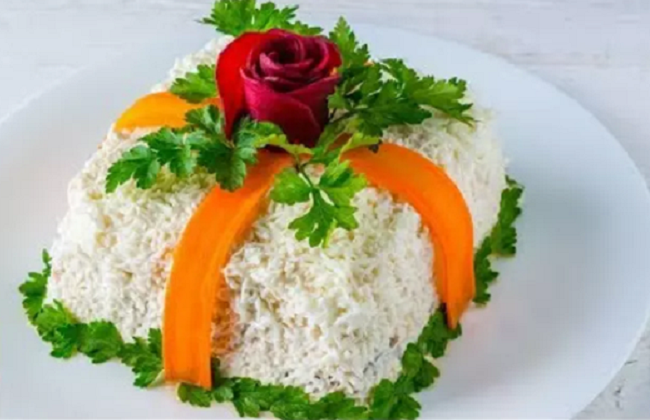 Для приготовления понадобится: 300 грамм отварного или запеченного куриного филе 4 вареных яйца луковица 4 средних морковки (3 вареных + 1 сырая) небольшая сырая свекла 250 грамм маринованных шампиньонов яблоко половинка маленького лимона 80 грамм твердого сыра 150 грамм майонеза по пол чайной ложечки соли и сахара 2 столовых ложки яблочного или обычного уксуса небольшой пучок петрушки. Последовательность действий: 1. В подходящей посуде соединяем соль, сахар, уксус, вливаем стакан кипятка и помещаем в полученный маринад нарезанный мелкими кубиками лук. Когда маринад полностью
