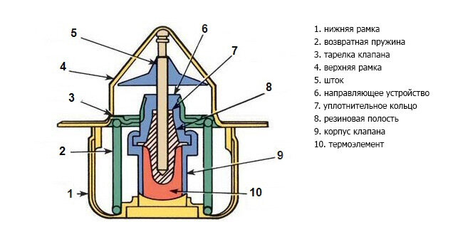 По какому принципу работает термостат: В термостате установлен термоэлемент: Термоэлемент состоит из корпуса, нефтяного воска, штока с тарелкой клапана, резиновой камеры, возвратной пружины.