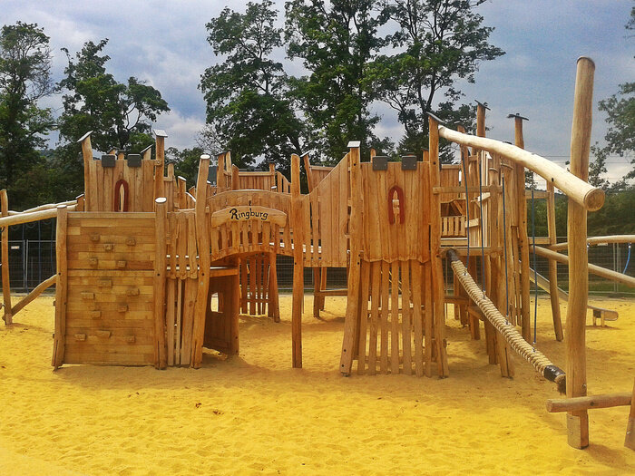 А ведь всё может быть гораздо лучше. Никаких штампованных башенок из фанеры, жутких железок и кислотных красок, только натуральное дерево и блестящая нержавеющая сталь. Зато тут есть огромное количество самых разных штуковин, которые так нравятся детям: канат, мостики, турники, горки и многое другое. Да и сама площадка выглядит как настоящий замок. Не меньше внимания уделено и окружающей территории: песочница для малышей, скамейки для родителей,теннисный стол для всех желающих. Вокруг комплекса