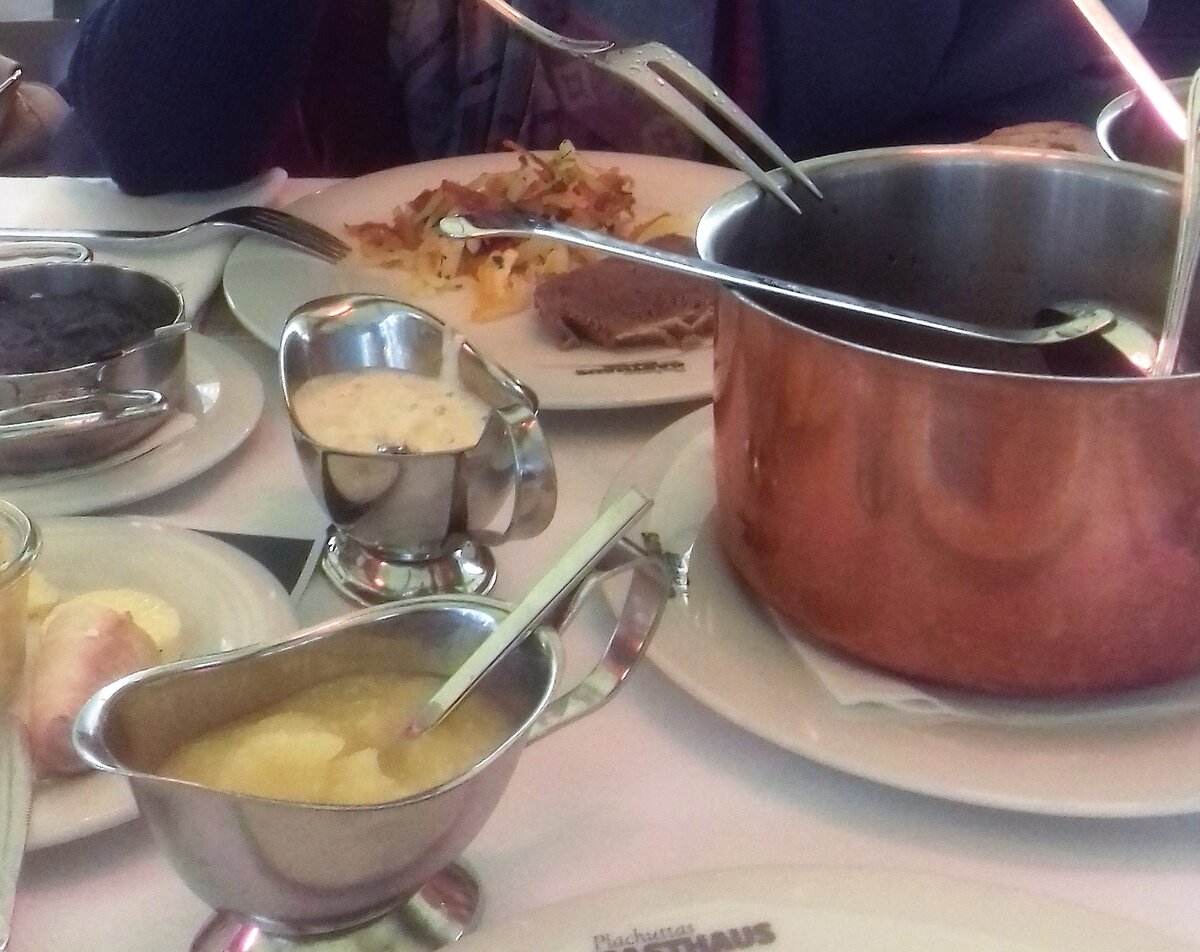 Гастрономические достопримечательности австрийской столицы в моих глазах были весьма просты: много хорошего кофе, штрудель, торт "Захер" и венский шницель размером с тарелку... Ну и всё. Поэтому когда перед очередным моим визитом в Вену подруга начала взахлёб рассказывать о каком-то невероятном говяжьем бульоне с мозговой косточкой, я озадачилась. И заинтересовалась, конечно. Упомянутое блюдо называется тафельшпиц. Говорят, его обожал император Франц Иосиф. И это скорее целый гастрономический ритуал, нежели просто еда. Заказ в ресторане Plachutta (специализируется на нём!) подразумевает, что вам принесут сразу несколько тарелок и кастрюлек. Главный герой -- это, конечно, наваристый говяжий бульон с травами, кореньями и прочими приправами. В нём плавает пара кусочков отличной варёной говядины и мозговая косточка. Мясо просто тает во рту, очень мягкое, отличной структуры (и для стейка бы подошло!). Также к этому блюду обязательно подают два соуса (яблочный хрен и что-то на сметанной о